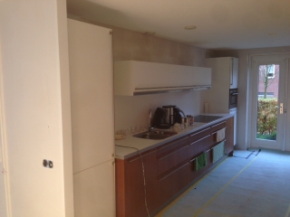 Al naar gelang de oppervlakte van het plafond zullen wij een steiger plaatssen om het plafond er zo strak en vlak als mogelijk in te maken .Tevens kunt u kiezen voor een afwerking met lijsten en rozetten, of met een strak gestuukte plint